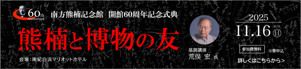 ※当館は南方熊楠の文献・標本類・遺品を保存・展示しておりますが、お問い合わせへの回答ができませんので、あらかじめご了承ください。 |
