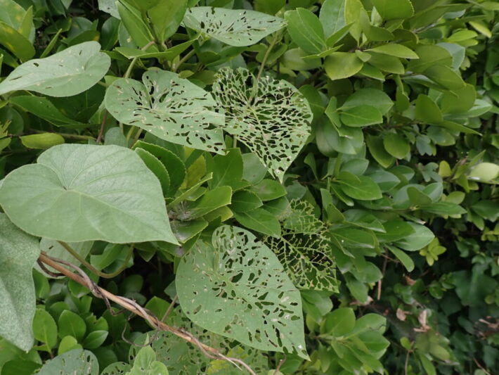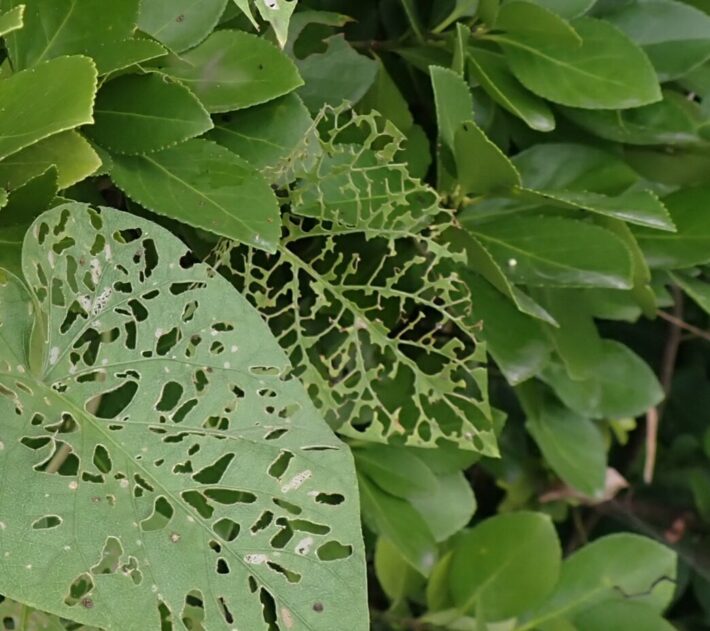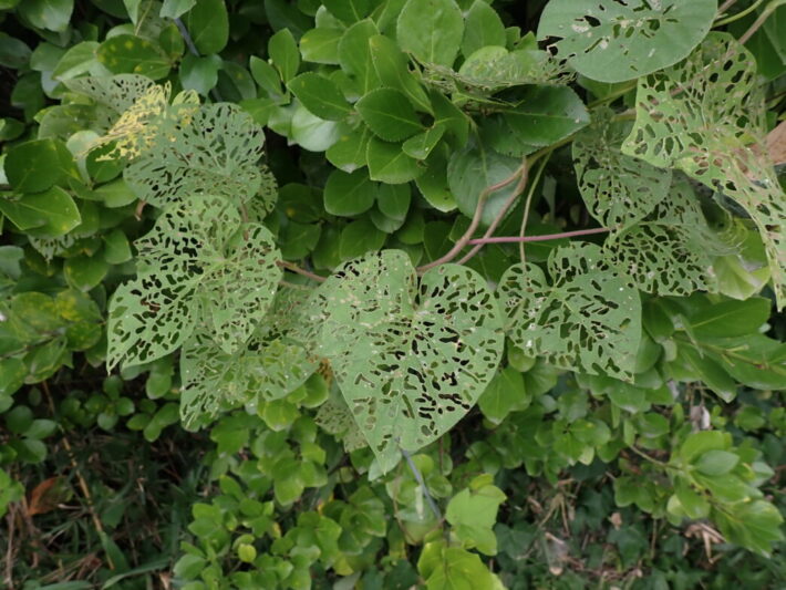 芸術的な食べ方 公開日:2025年09月06日 こんにちは閑話猿です。 道を歩いていたら、虫に食い荒らされた葉を見つけました。なかには葉脈だけ残され、迷路のようになっている葉もあります。もはや凄い食欲ですし、芸術的な食べ方ですね。 こんな状態にした犯人は何虫なのでしょうか。