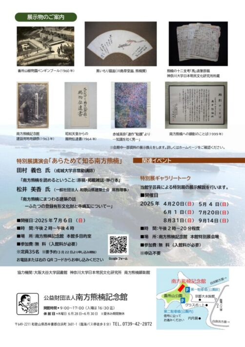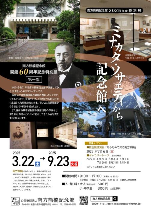 開館60周年記念特別展は9月23日まで 公開日:2025年09月16日 こんにちは閑話猿です。 現在開催中の開館60周年記念特別展「ミナカタ・ソサエティから記念館へ」は9月23日(火・祝)までの開催となります。 この展示では、昨年神奈川大学日本常民文化研究所で発見された南方熊楠の直筆原稿や川島草堂が描き、熊楠が都々逸を書いた「黒イモリ扇面」や懐かしい昔の白浜の写真などを展示しています。 是非この機会にこの特別展を御覧ください。