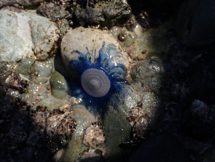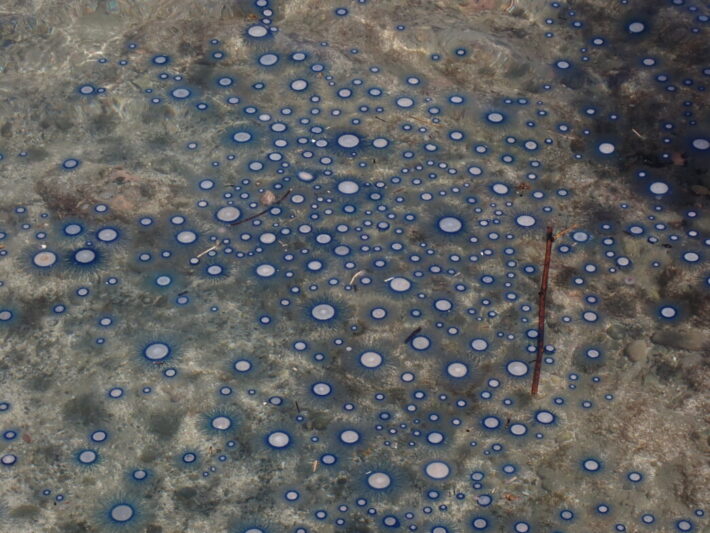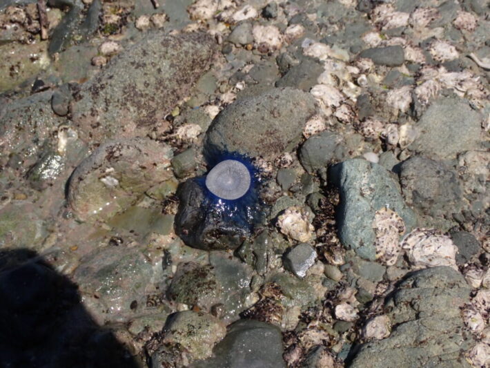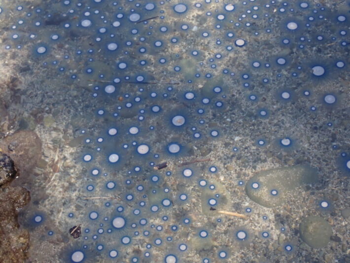 さらに水辺の方には、このクラゲが大量に漂っていました。まるで水に浮かべた油の被膜のようにも見えます。このクラゲは微量ながら毒を持っているので、触らないようにしましょう。
