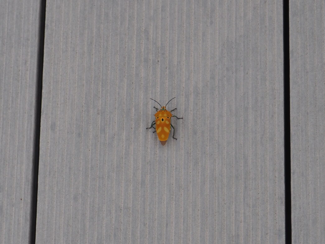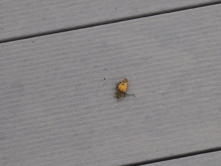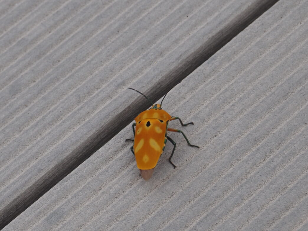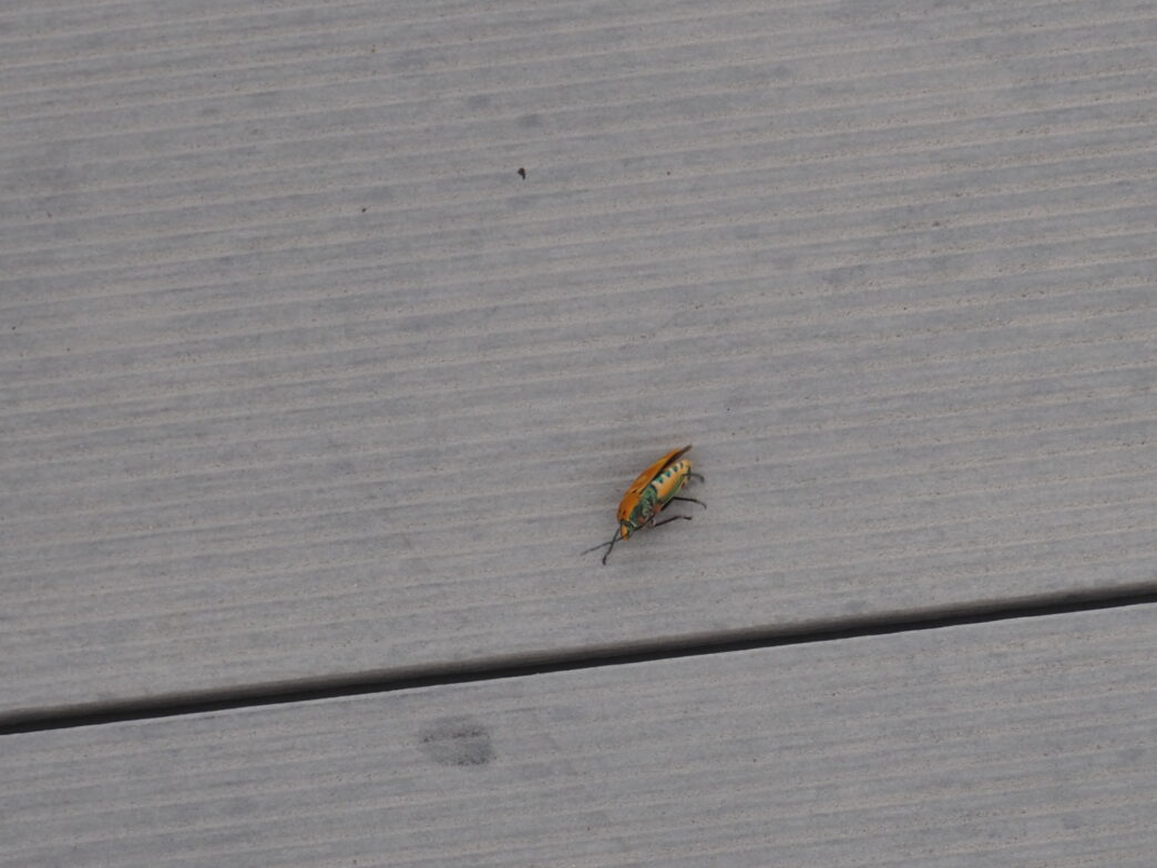 屋上のアカギカメムシ 公開日:2025年10月04日 こんにちは閑話猿です。 屋上にアカギカメムシがいました。熱帯から亜熱帯の地域にいるカメムシですね。 当初オオキンカメムシかと思いましたが、見たことのない模様だったので撮影しました。 近づくと、イソイソと逃げていきます。そして近くで足を鳴らすとひっくり返りました。攻撃されたときの擬死状態なのでしょうか。