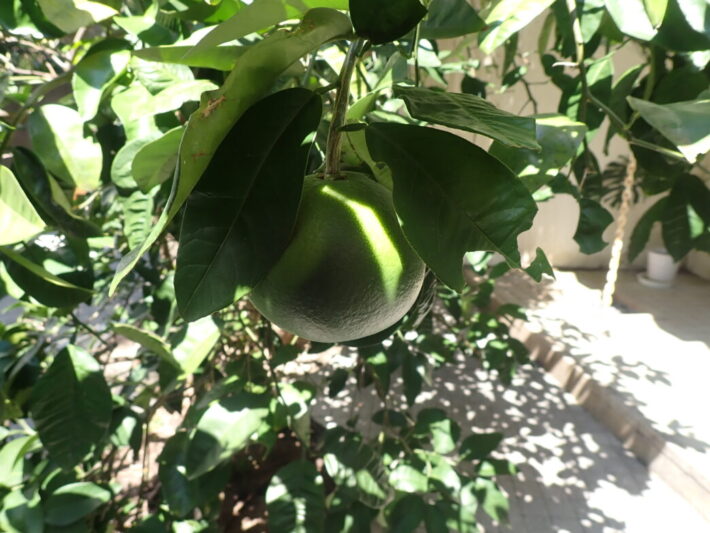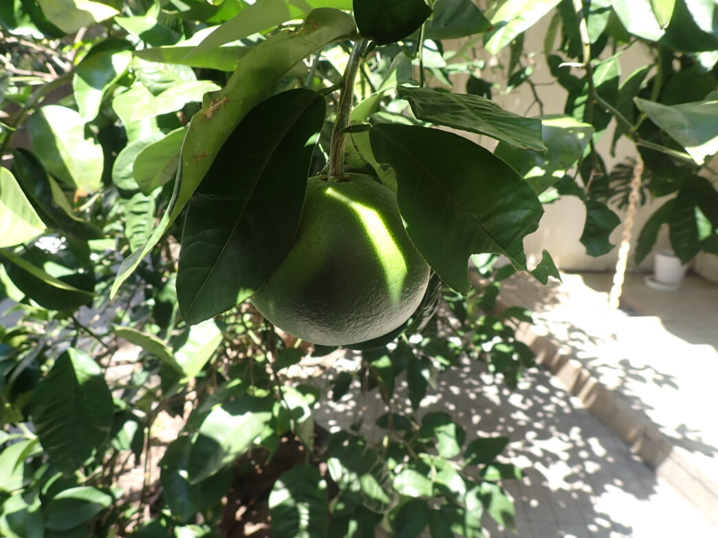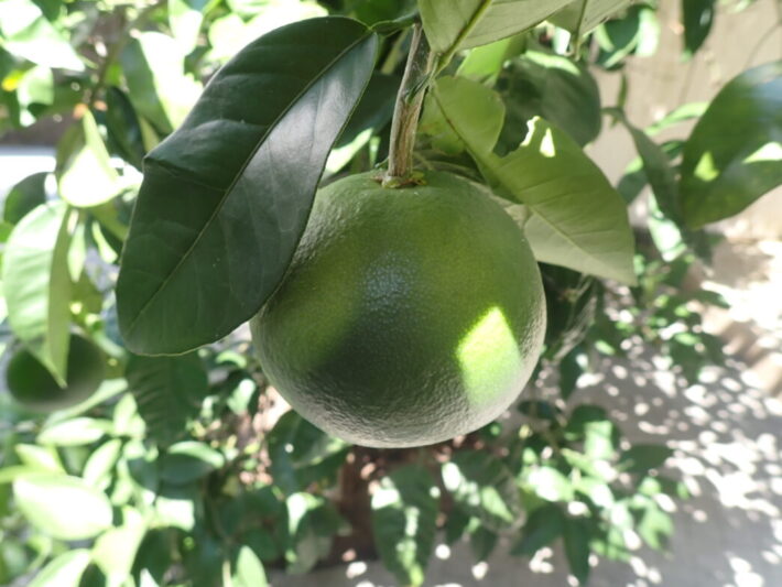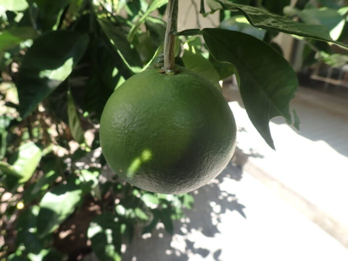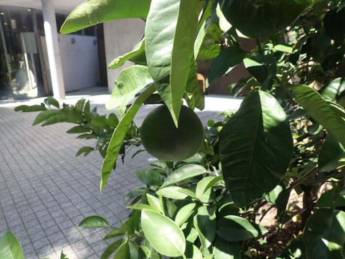 ちょうど葉で隠れていた部分は、若干色味が薄く、まるで日焼けのようですね。今年は本館前には2つしか実っておりませんが、ここから黄色く色づいてくれることでしょう。