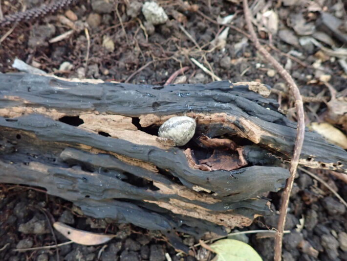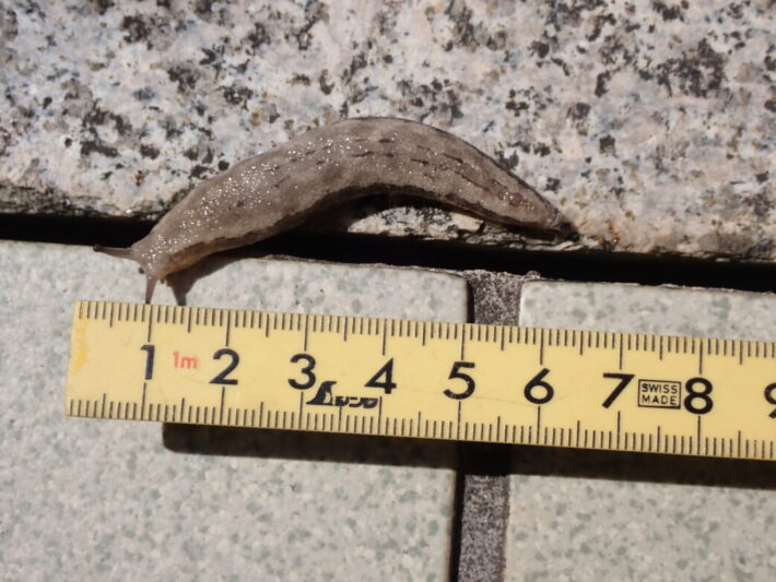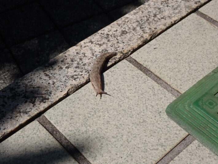 日向に出てきたナメクジ 公開日:2025年10月18日 こんにちは閑話猿です。 10月だというのに、天気予報では「夏日」という表示がでています。そんな天気の良い日に本館入口にフツウナメクジがいました。10cmもないナメクジですが、大きいですね。 入口前で踏まれては気味が悪いので、森の朽木に置いておきました。ナメクジは攻撃されたと思ったのか、丸まっていました。