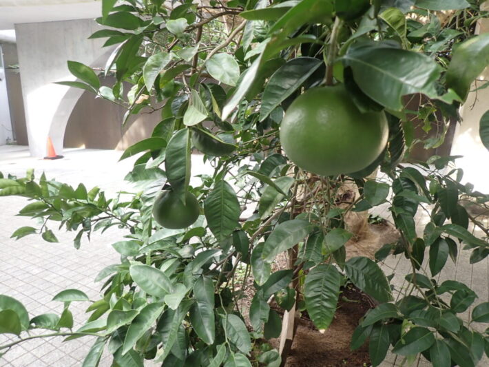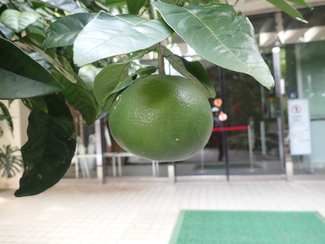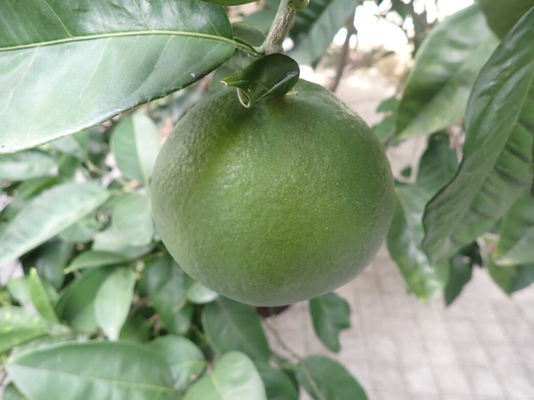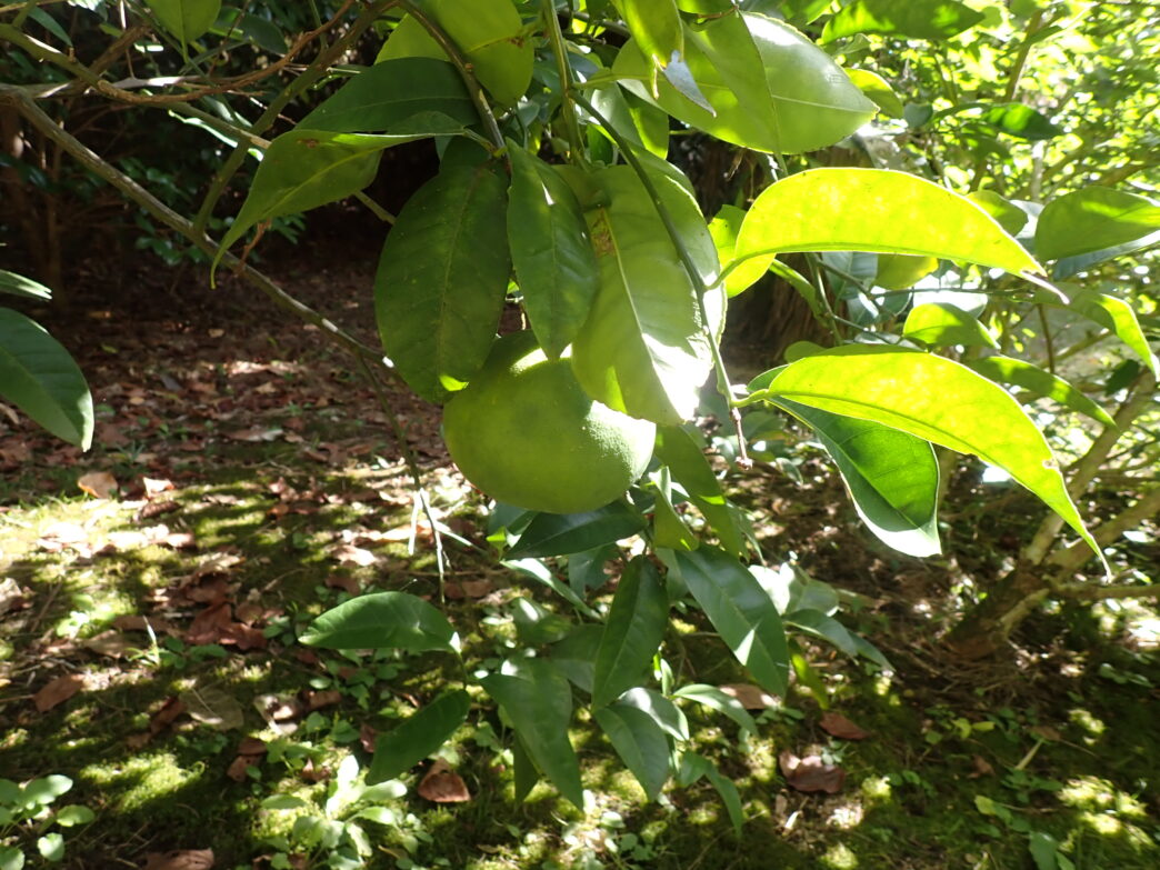 安藤ミカンの近況 公開日:2025年11月03日 こんにちは閑話猿です。 11月を迎えた安藤ミカンです。当館本館前には2つ、番所山公園のメタセコイヤ近くには1つ実っていました。 まだまだ実が黄色く熟れてきていません。特に昨年はメタセコイヤ近くのものが野生動物に荒らされていたので、今年は機会をうかがって荒らされる前に収穫しようと思います。