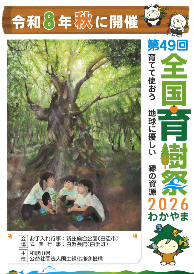 育樹祭は令和8(2026)年11月7日にお手入れ行事を新庄総合公園(田辺市)、式典行事が翌8日に白浜会館(白浜町)で開催されます。