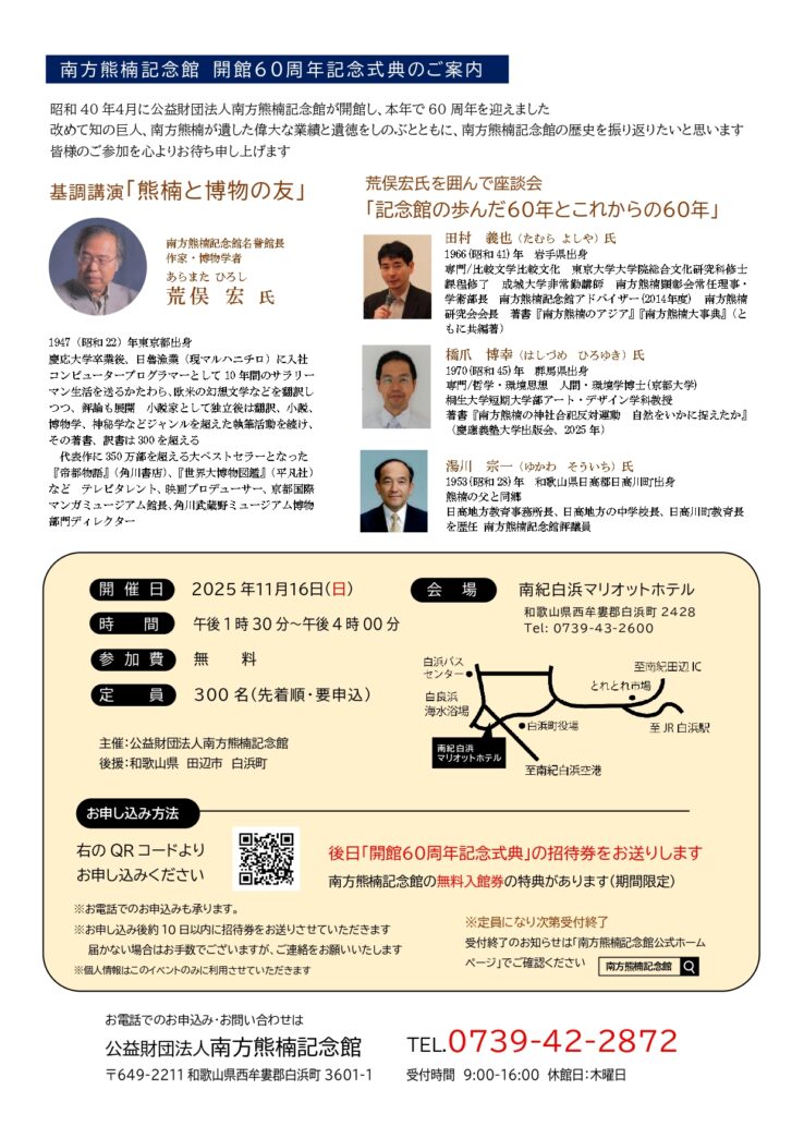 開館60周年式典申込みは電話:(0739)-42-2872 もしくは、以下のリンク先の応募フォームからお申し込みください。(応募フォームからのお申し込みは11月11日まで)