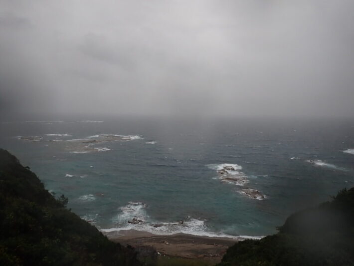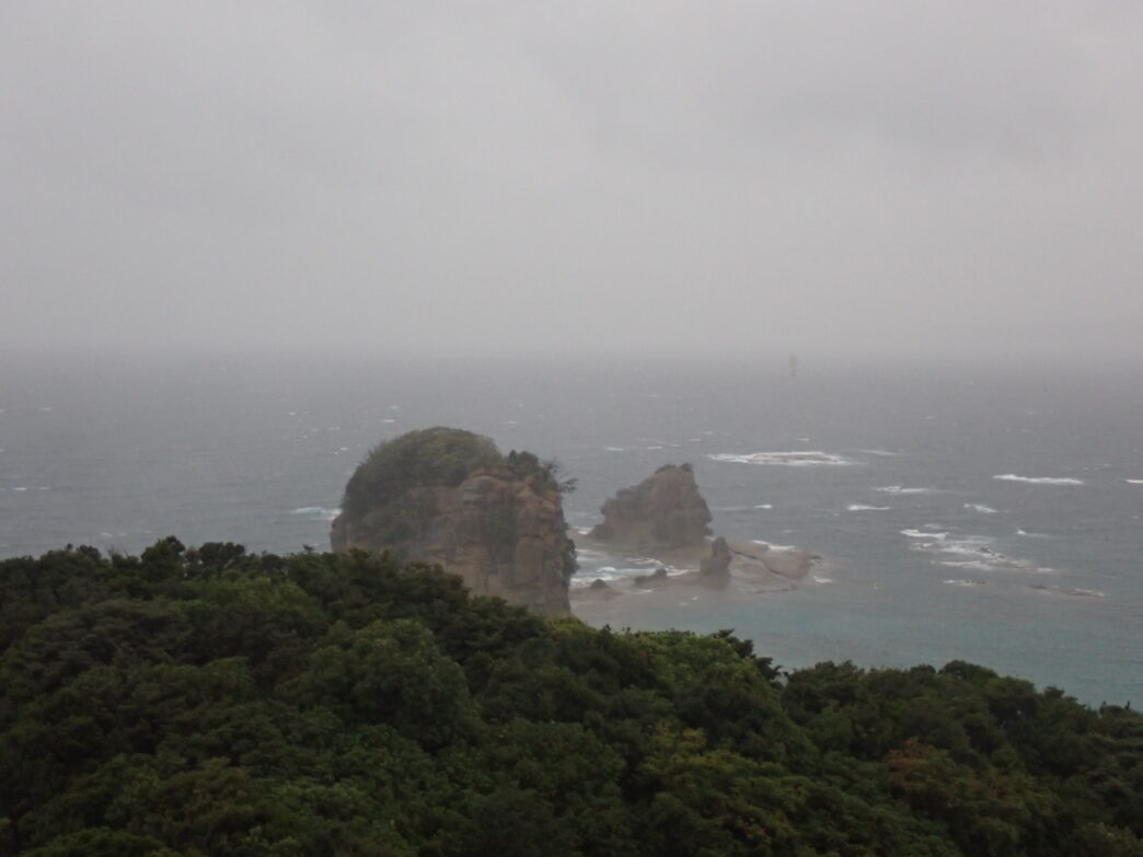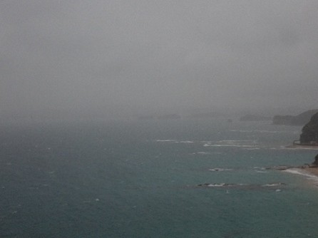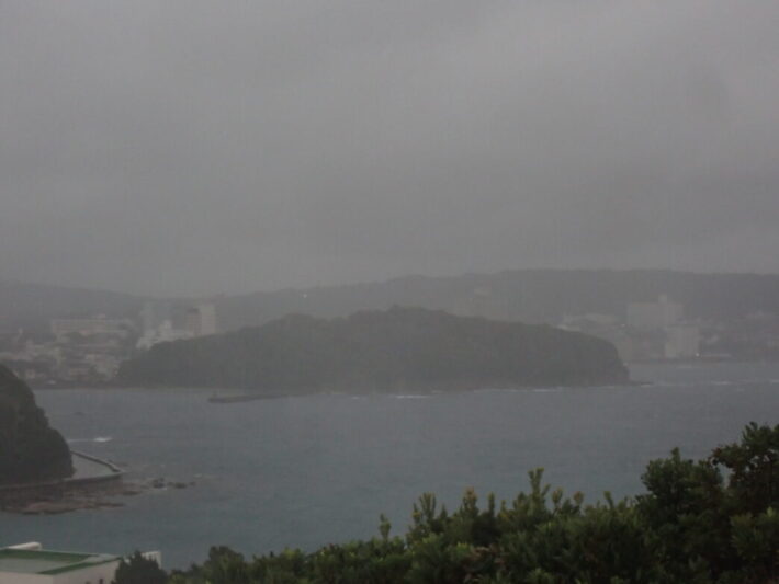 嵐の中見る神島 公開日:2025年11月11日 こんにちは閑話猿です。 11月初旬に雨が降った時の写真です。この時、対岸の田辺市街方面は白い霧に覆われていました。そして神島も次第に白く霞んでいきました。 北西方面からの強風と雨により、すぐカメラのレンズに雨がかかってしまいます。夕方には単なる雨ではなく、嵐のようになっていました。