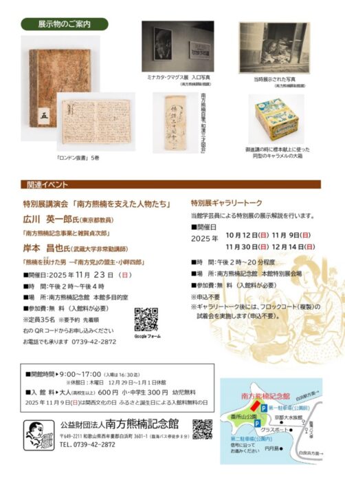 特別展講演会は「南方熊楠を支えた人物たち」題して、熊楠が最も信頼したとされる雑賀貞次郎、南方一門の盟主と言われる小畔四郎についてお二人の方に講演をしていただきます。