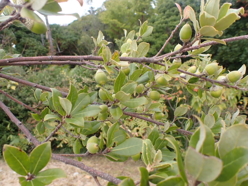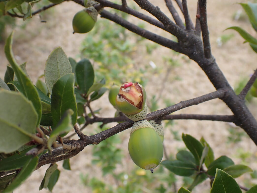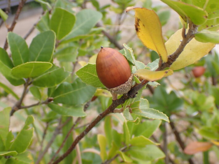 気の早い発芽 公開日:2025年11月22日 こんにちは閑話猿です。 番所山第二駐車場横のウバメガシにどんぐりが実っています。そのなかで見つけたものは、まだ青い状態でしたが、殻を破り芽が出ていました。時として、虫喰いによって枝で発芽することもあるようですが、このどんぐりはなぜ発芽したのでしょうか。そして、この枝のままどうなっていくのか、経過をみていこうと思います。 他のどんぐり