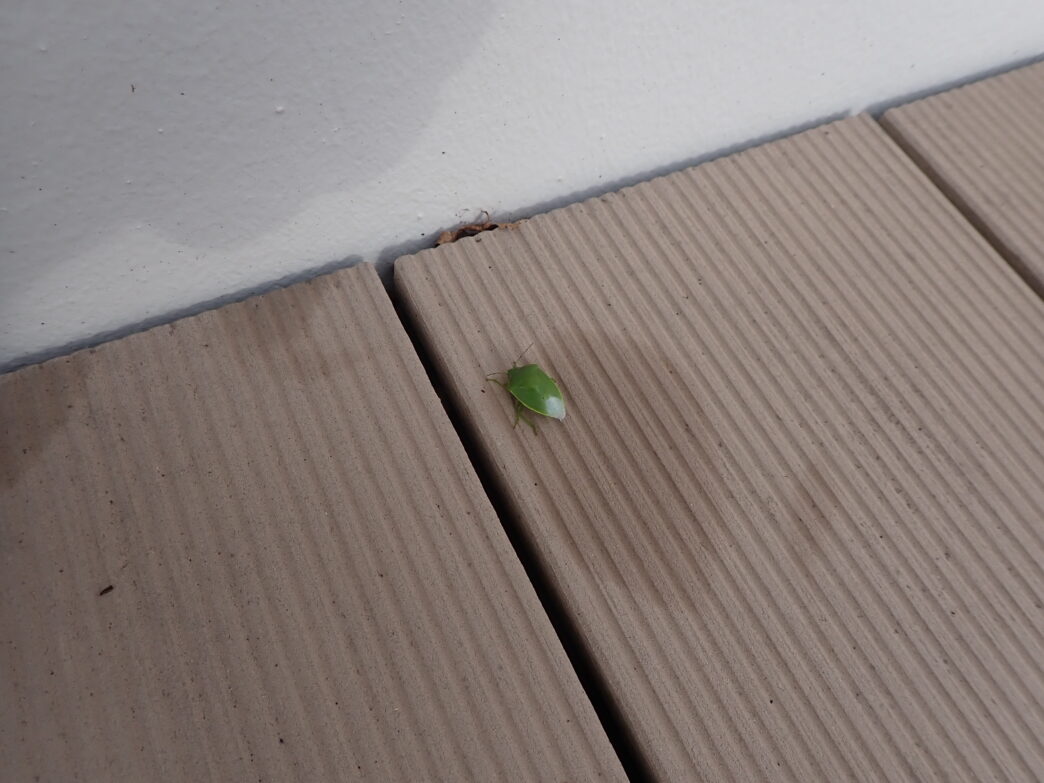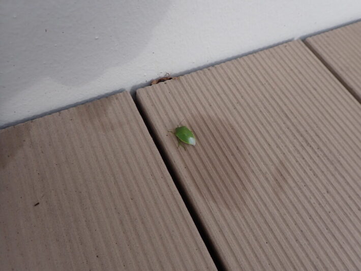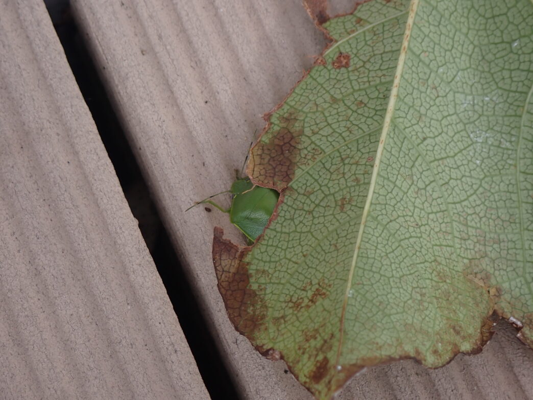 屋上に吹き上げられた落ち葉を掃除していたところ、その下にカメムシがいました。