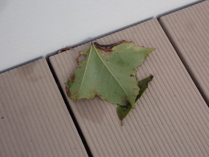 この葉を隠れ蓑にして、冬を越そうとしたのでしょうか。残念ながらちり取りで回収し、番所山の中へ捨てておきました。屋上よりも越冬場所は多いことでしょう。