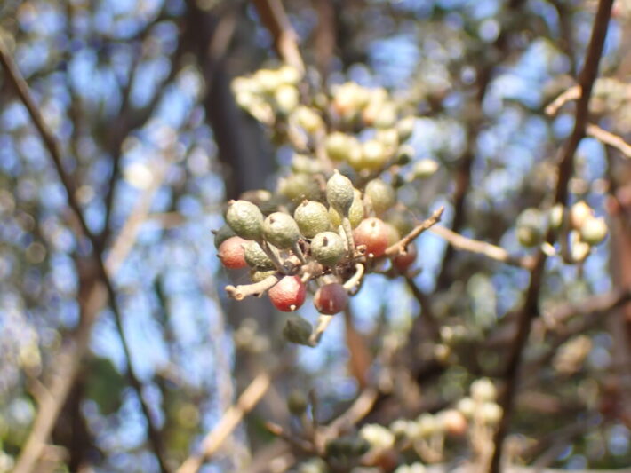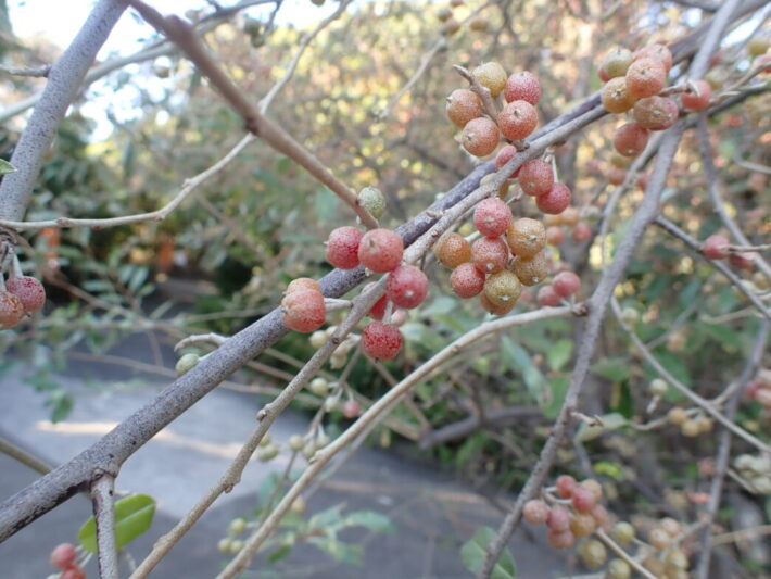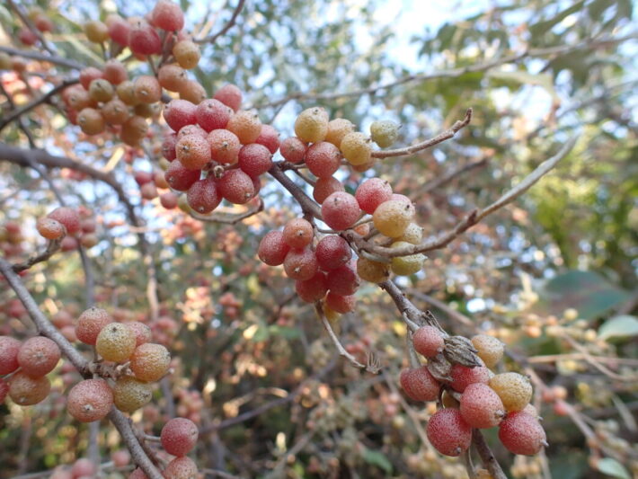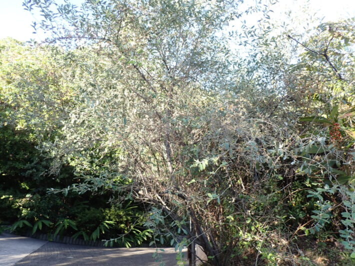 色づくアキグミ 公開日:2025年12月10日 こんにちは閑話猿です。 アキグミ(秋茱萸)が色づいてきています。豆粒大の小さいグミがたくさんついていたものが、次第に色づいてきました。 ナワシログミのように食べ応えがあまりなく、若干渋みがあります。このアキグミは痩せた土地でも育つため、緑化に利用されることもあるようです。