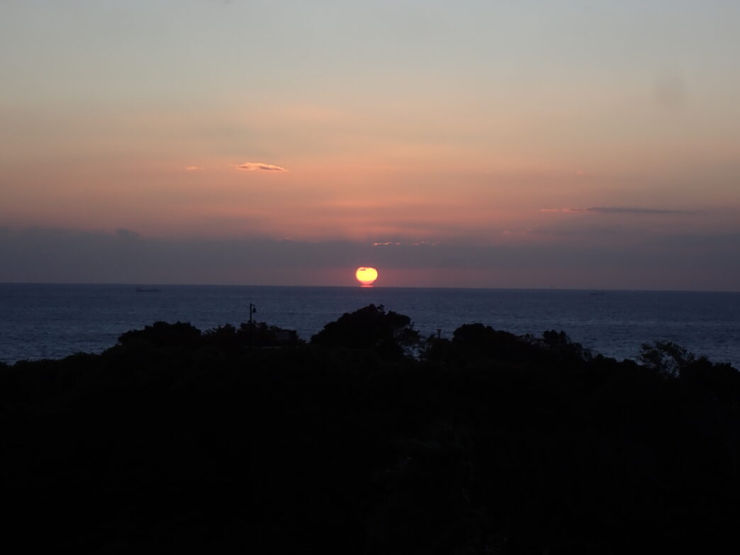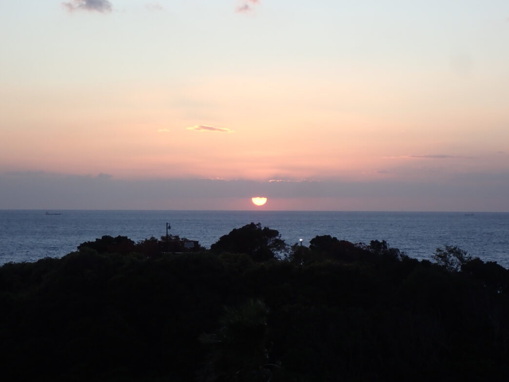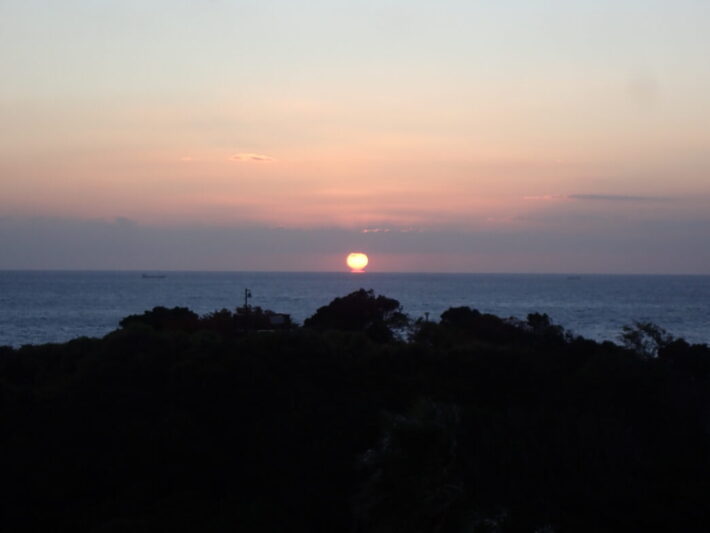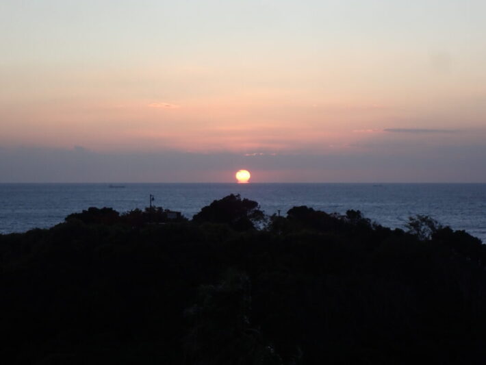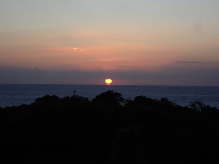 屋上からダルマ夕陽が見えました 公開日:2025年12月12日 こんにちは閑話猿です。 今年初めて当館の屋上からダルマ夕陽が見えました。気温が低くなり、水平線上の雲がなくなってきました。そのため、日没時に水平線へ沈む夕陽の光の屈折による蜃気楼でダルマ夕陽になっていました。 これからの季節円月島の海蝕洞に沈むダルマ夕陽が見られることでしょう。