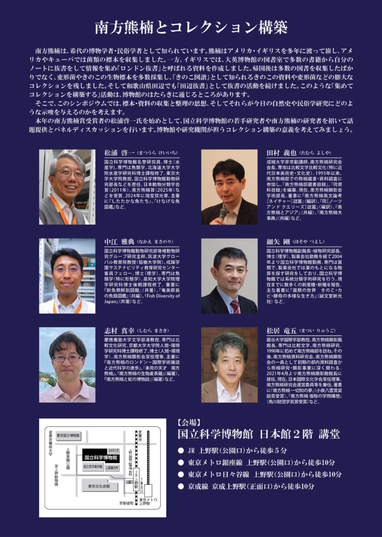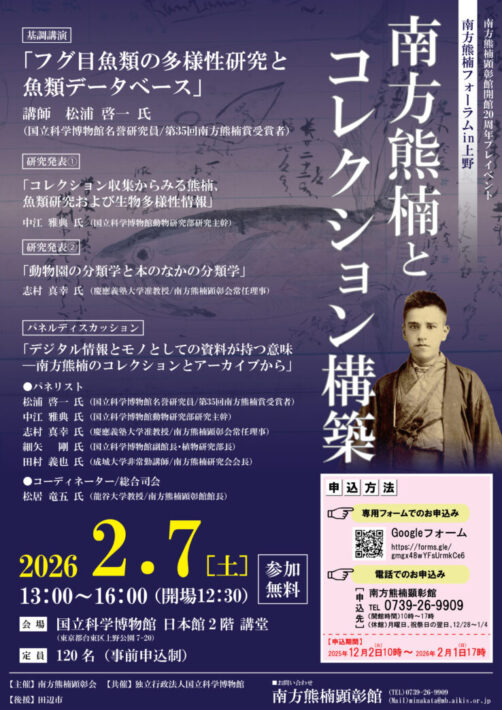 2025年5月に第35回南方熊楠賞を受賞された松浦啓一先生(国立科学博物館名誉研究員)のご受賞を記念した基調講演のほか、南方熊楠顕彰館館長の松居竜五氏や田村義也氏、志村真幸氏にもご登壇いただき、研究発表やパネルディスカッションを行うとのことです。