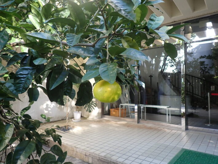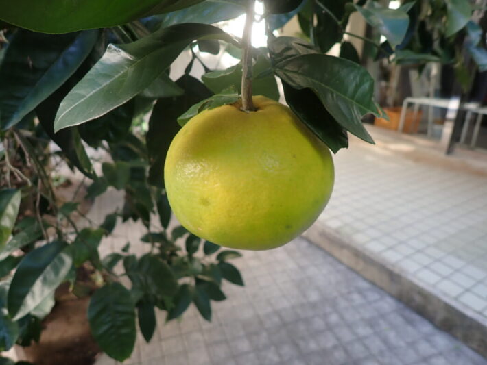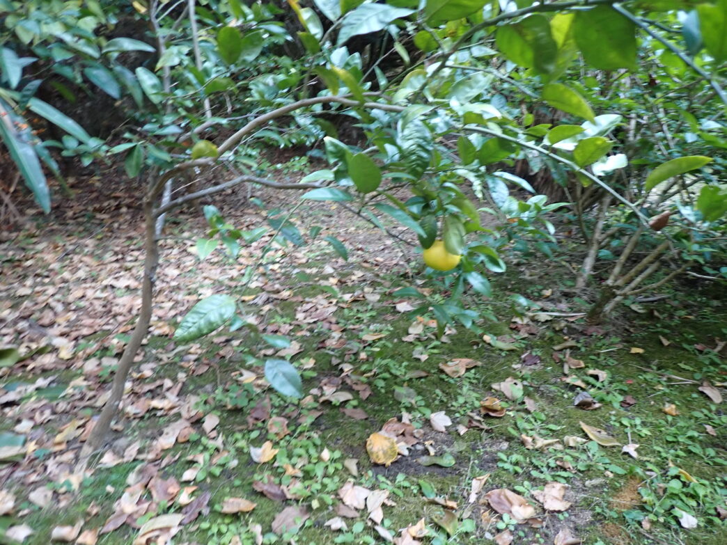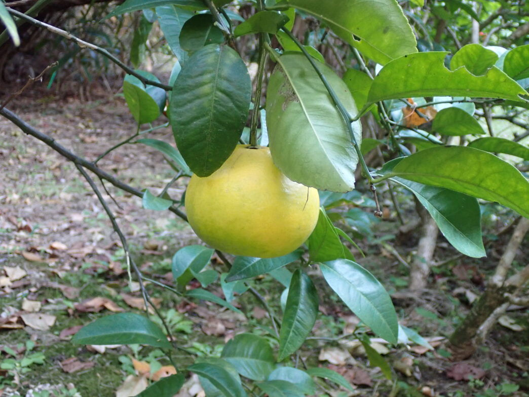 色づいてきた安藤ミカン 公開日:2025年12月20日 こんにちは閑話猿です。 当館本館前と番所山公園内の安藤ミカンが色づいてきています。これまで濃い緑色をしていましたが、朝夕の寒暖の差で黄色く色づいてきました。 今年はどちらの木も実がひとつずつ実っています。公園内のものは、実の重さで木がしなっているため、野生動物に狙われそうです。