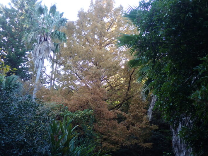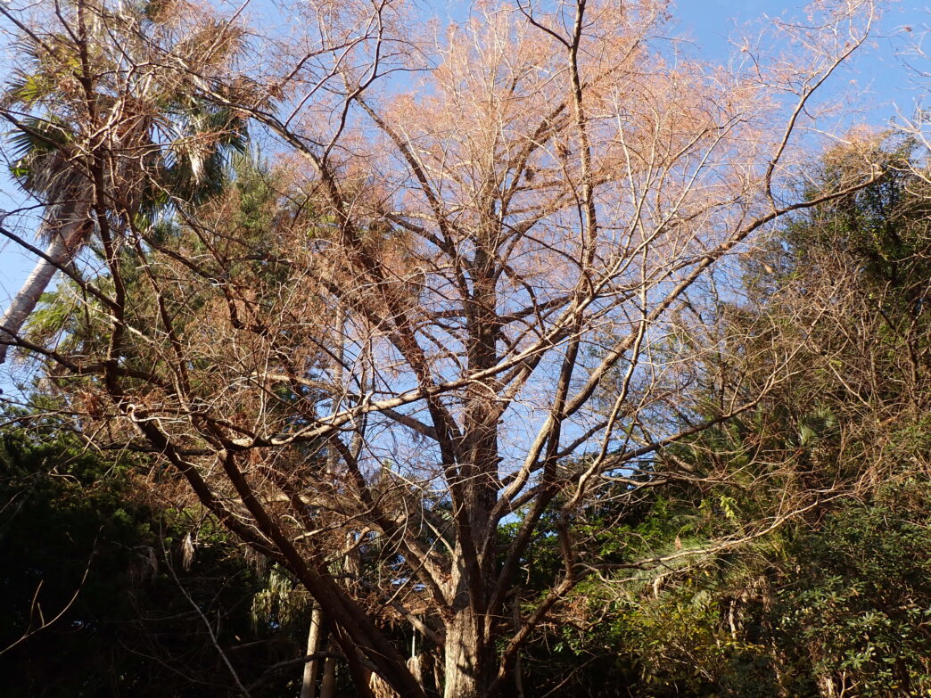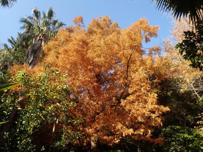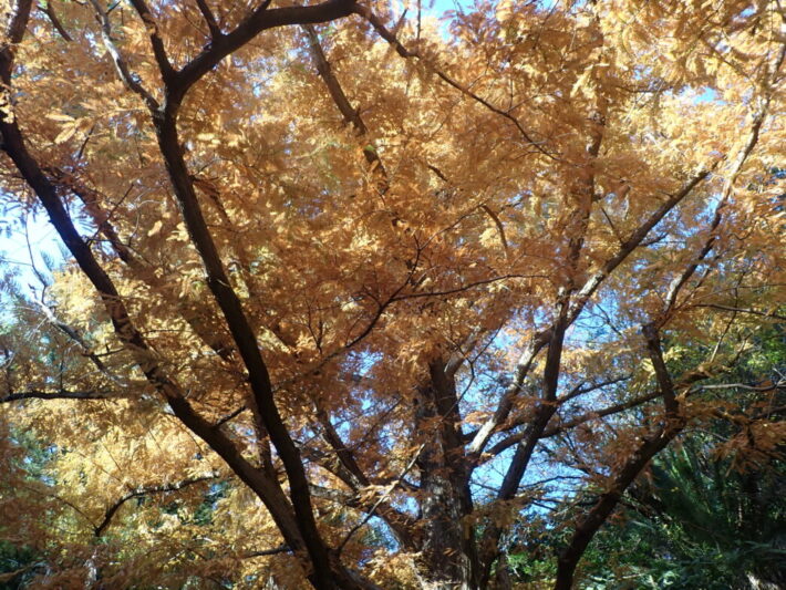 番所山公園のメタセコイアが落葉しています。10月頃にはまだまだ緑が鮮やかでしたが、11月後半になると紅葉し、年があけるとほぼ葉が落ちました。
