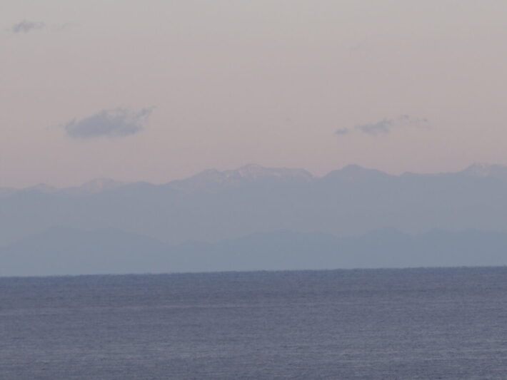 海を越えて見える山の雪 公開日:2026年01月16日 こんにちは閑話猿です。 朝当館の屋上から徳島県がよく見えました。特筆すべきは、山に雪化粧がされているという点でしょう。朝の空気が澄んでいる時間だからこそ見られる景色です。 そしてこの雪が見える山で最も高いのは、徳島県の剣山だと思われます。剣山は標高が1955mと西日本で2番目に高い山です。その右側にも剣山ほど高くはありませんが、山の雪化粧が見られました。 空気が澄んでいる冬ならではの特別な光景ですね。一方熊野の山々には雪は見られませんでした。