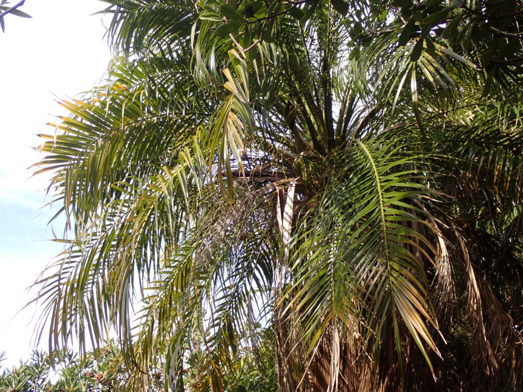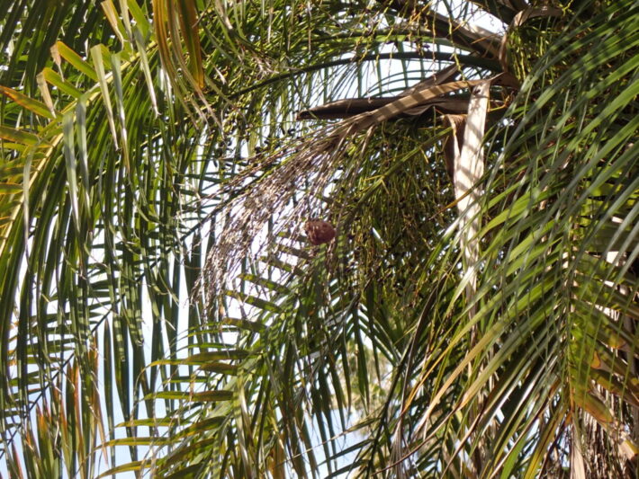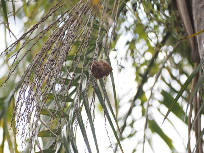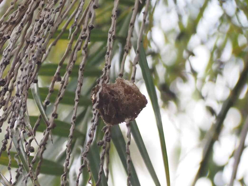 高いところにあるカマキリのタマゴ 公開日:2026年02月03日 こんにちは閑話猿です。 番所山公園を散策中に、頭上にカマキリのタマゴを発見しました。 カナリーヤシ(フェニックス)の葉の先端にタマゴがついています。凡そ2メートル以上のところにあり、まだ孵化していないように見えます。 カマキリのタマゴの高さはその年の積雪量に関係し、雪に埋もれない高さにあるという俗信があります。なぜ雪もまず積もらない白浜で、風も強い高い場所にタマゴをつけたのでしょうか。