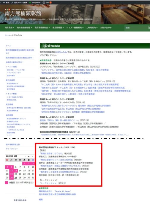 上記動画は、南方熊楠顕彰館Pの公式YouTube紹介ページ(https://www.minakata.org/youtube/)の下部にリンクが貼ってあります。そこからYoutubeでご覧いただけます。