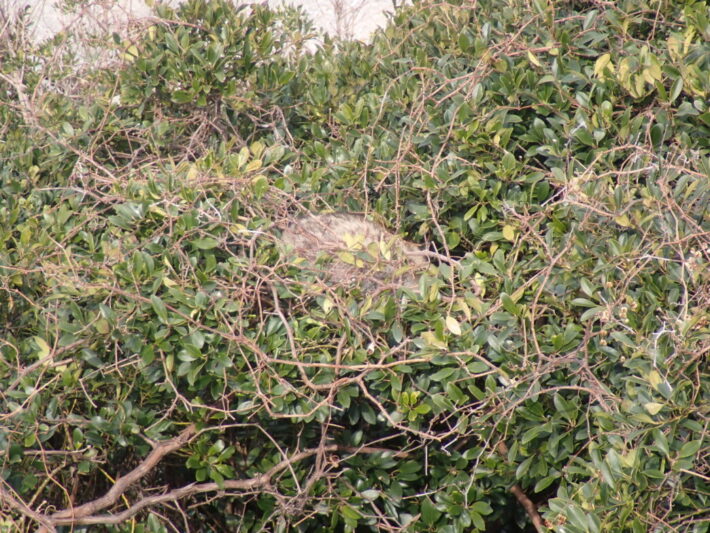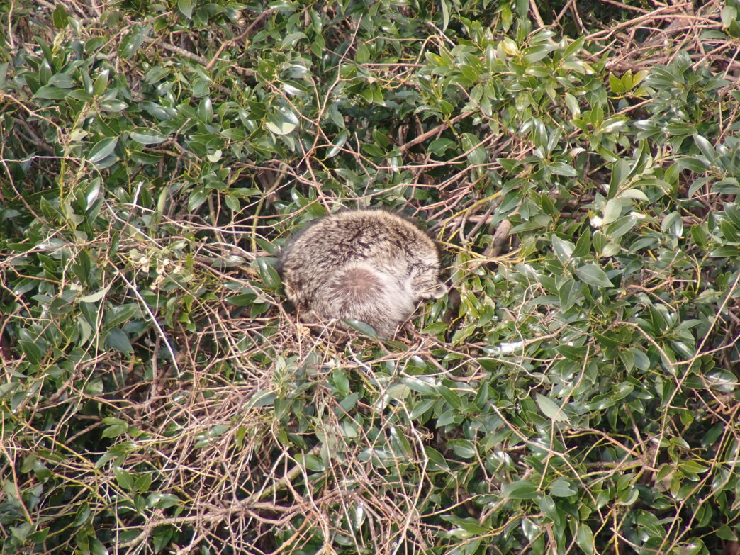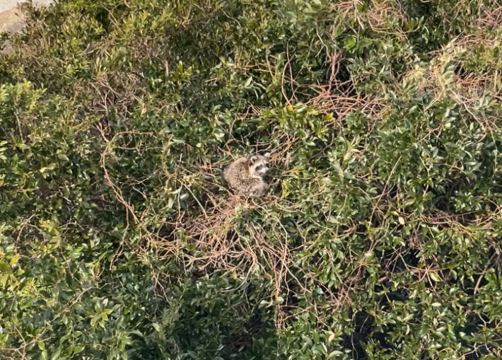 来館された方から、「屋上から見える木の上に何かいる」とのことで行ってみると、アライグマが2匹丸まって寝ていました。