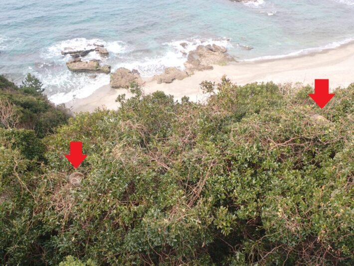 2枚目の写真ではアライグマがいる場所に矢印をつけました。離れたところに2匹が丸まっていることがわかります。