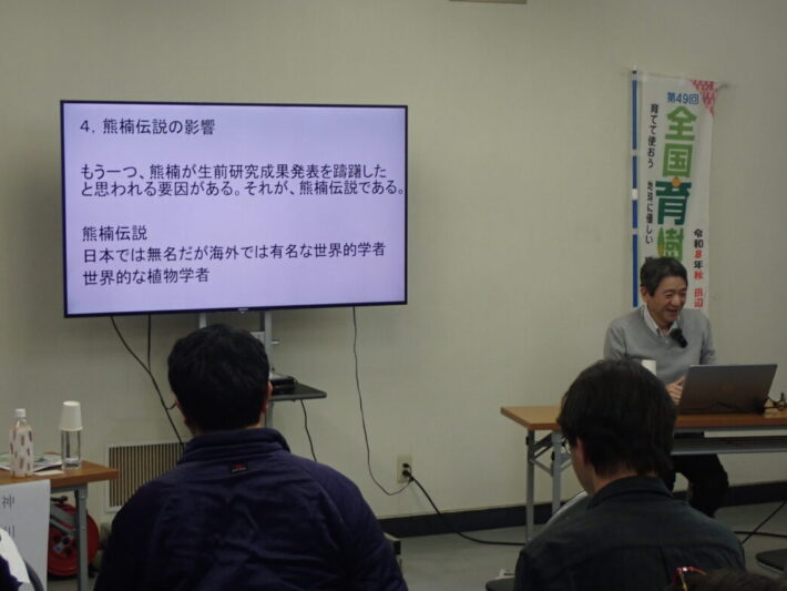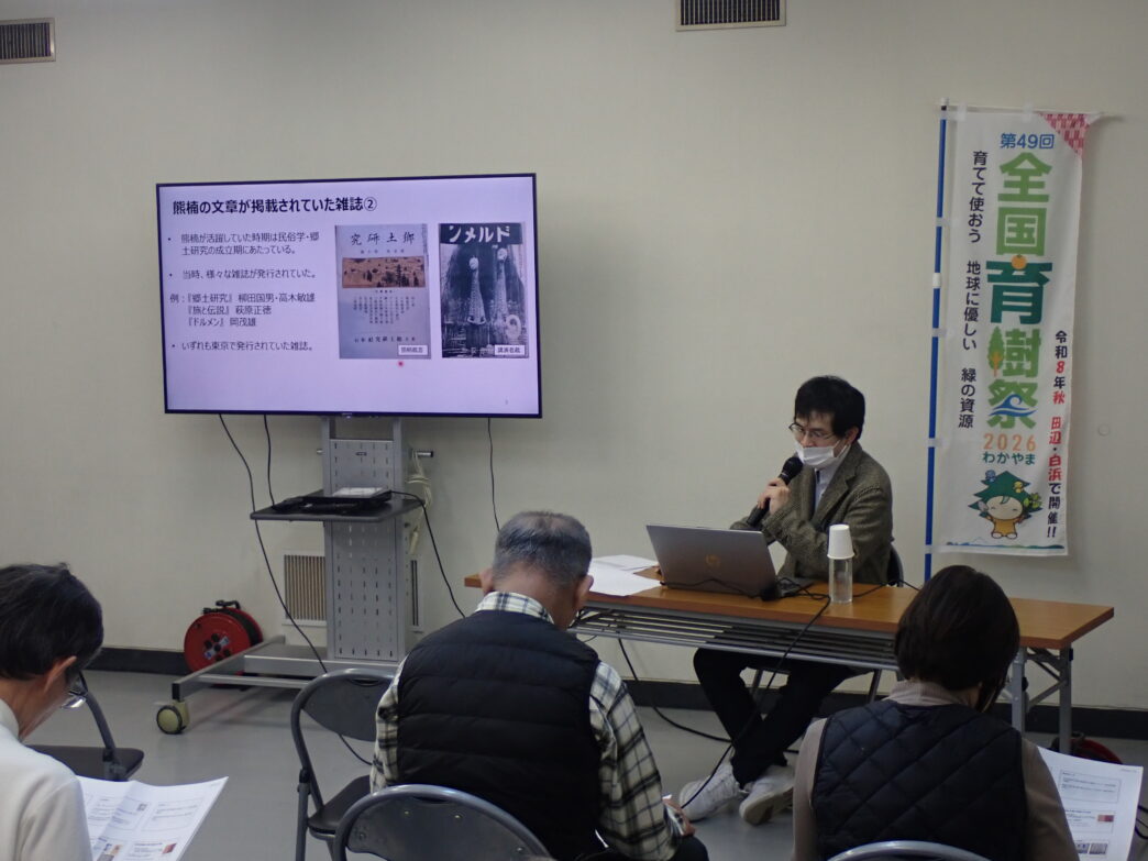 雲藤氏は、熊楠が生前に3冊の単行本を出版した背景と出版後の状況をお話いただきました。そして熊楠が単行本以外にも植物関係の書籍を計画していたにも関わらず、出版できなかった背景の分析をご発表いただきました。