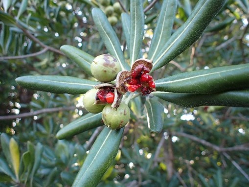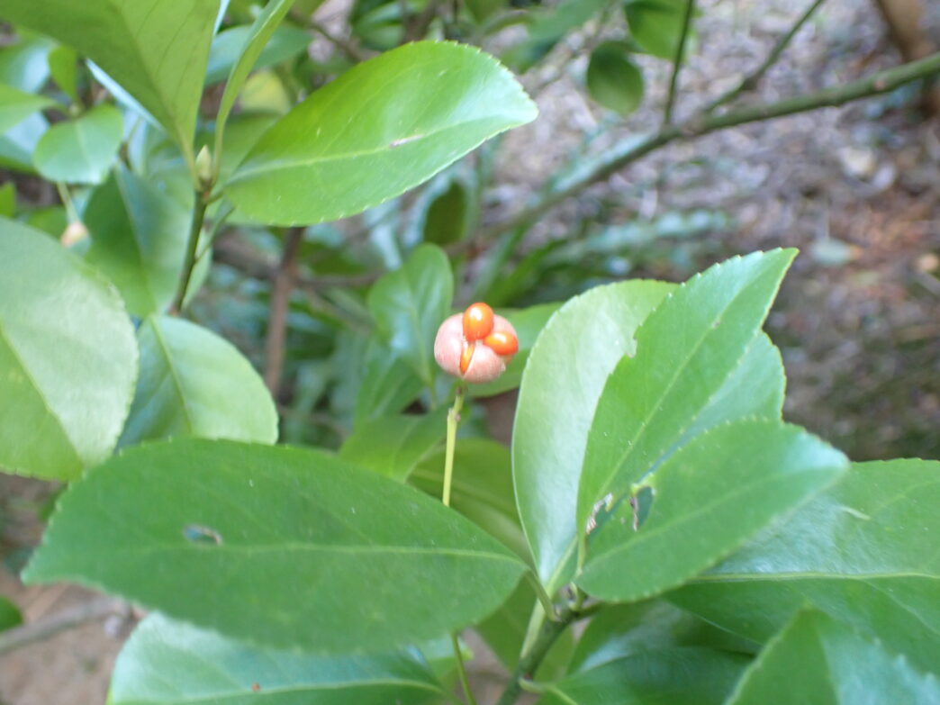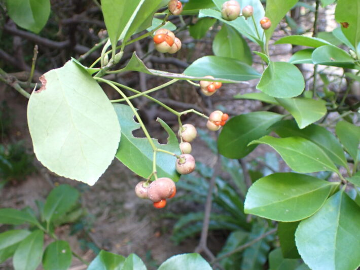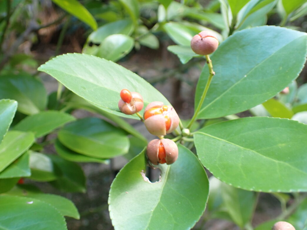 四つにはじけるマサキの実 公開日:2026年02月24日 こんにちは閑話猿です。 番所山公園入口に生えているマサキに実がついています。熟したこの実は、殻が四つに分かれ、中の赤い実が出ています。殻の隙間から出ている種子は可愛らしいですね。番所山にはマサキと同じく、殻が三つに割れるのはトベラです。 ちなみに、マサキは毒をもっているので、絶対に口に入れないようにしてください。 3つにはじけるトベラの実