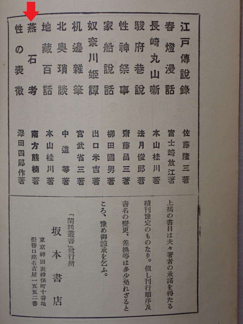 初期の刊行計画では、熊楠の『燕石考』もなぜかラインナップに入っていましたが、結局刊行されることはありませんでした。