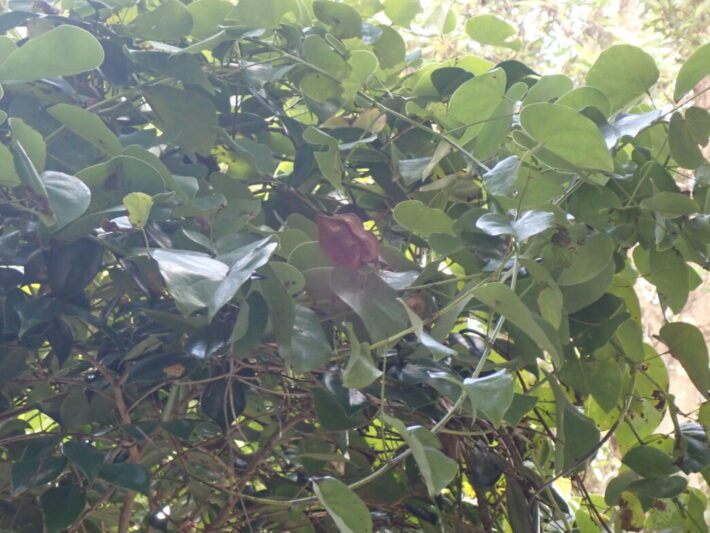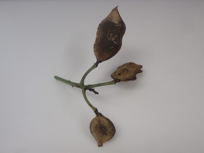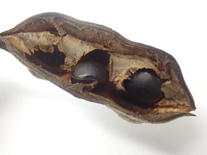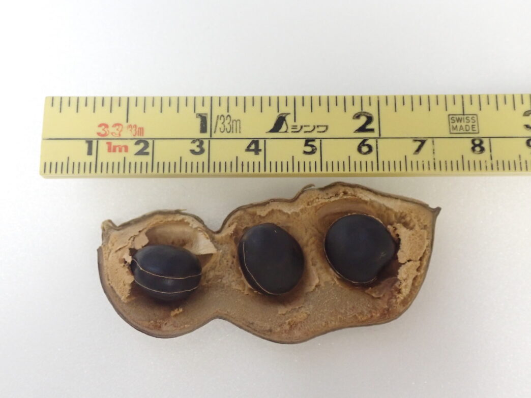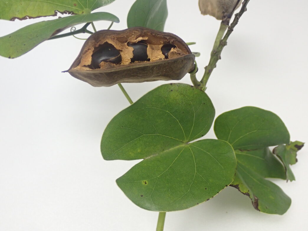 ハカマカズラの実 公開日:2026年03月07日 こんにちは閑話猿です。 新館横のヤブツバキにハカマカズラが盛大に絡みついています。そのツルに実がついていることを確認していましたが、黒い種子が落ちている形跡は見られませんでした。そのため、鞘ごと採集してみました。 ハカマカズラの鞘は約6~8cmの楕円形で、そのなかに1~3個の黒い種子が入っています。そして鞘が割れ種子を落とします。 この種子は非常に固く熊野詣の数珠に加工されることもあるようです。ちなみに、南方熊楠が没した際には、手にハカマカズラの数珠がかけられていたそうです。