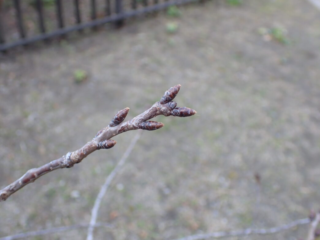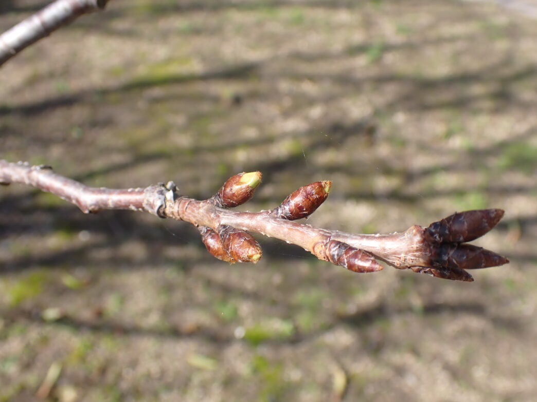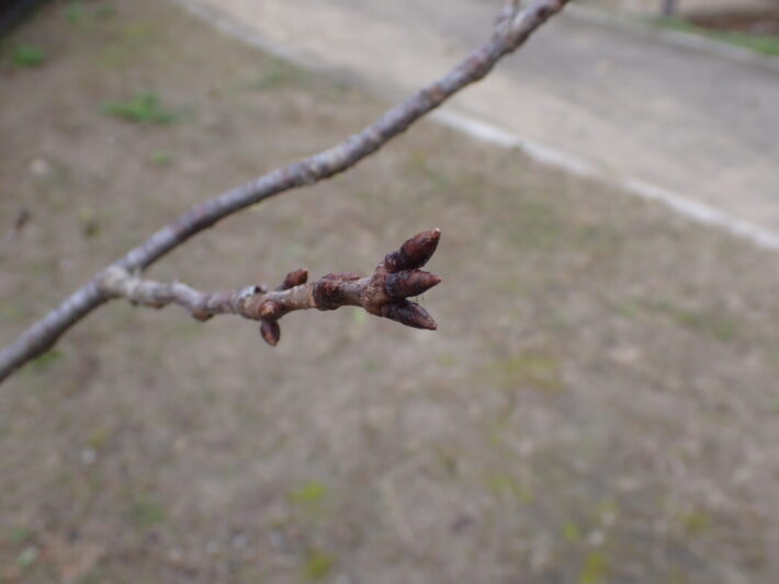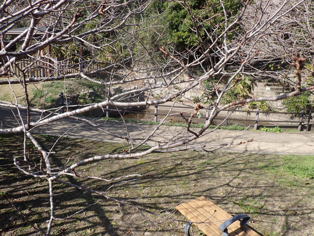 番所山公園では桜のつぼみが大きくなってきています。特にトンネルを抜けた先にある池の横にある桜のつぼみは、昭和天皇御製前のものよりも大きくなってきています。