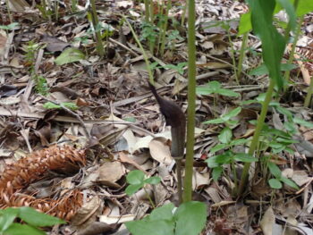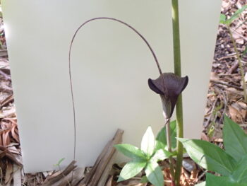 今の時期、急坂を登っているとこの釣り糸を垂らしたようなウラシマソウを観察できます。キノコバエだけでなく、人間の好奇心を刺激する形状をしていますね。