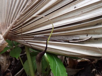 まるで食虫植物を想起させる仏炎苞で、この中に花である肉穂花序(にくすいかじょ)があります。そして釣り竿のような花序付属体(かじょふぞくたい)から匂いを発し、キノコバエを誘引し受粉させるそうです。