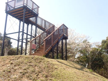 ②第3展望広場の展望塔  展望塔の横に桜があるため、円月島、紀伊水道と一緒に桜を見られます。そしてこの広場にはウコン桜もあるため、2種類の桜を堪能することができます。
