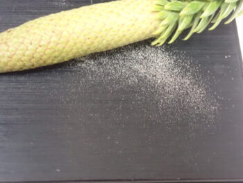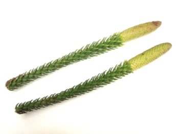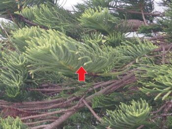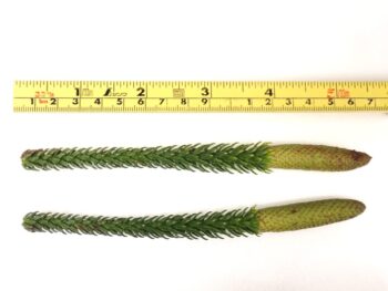 シマナンヨウスギの雄花が落ちていたそうです。通常の葉は根本から先端まで小さな突起があります。しかし雄花は先端部が鱗状となっており、全体の大きさは17cm程度です。