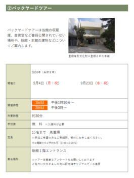 さらに5月4日にはバックヤードツアーを開催します。当館の収蔵庫、貴賓室など普段公開されていない場所や、新館・本館の建物などについてご案内します。