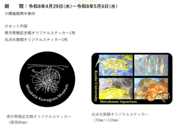 また4月29日(水)~5月6日(水)の期間で、ゴールデンウィーク!南方熊楠記念館と京都大学白浜水族館連携事業 「同じ日に両方行くと必ずもらえる!」キャンペーン!を開催しています。期間中に京都大学白浜水族館と南方熊楠記念館に両方同日入館された方に、両館のオリジナルグッズをプレゼントします。