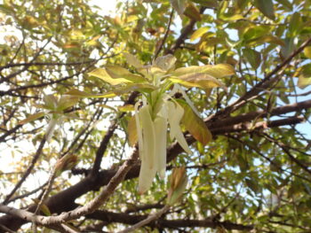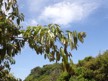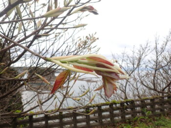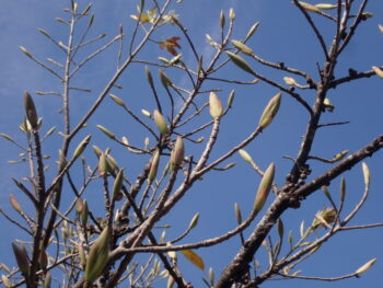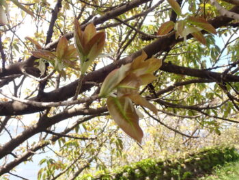 番所山公園では常緑樹の葉が生え替わっています。そのなかで、アコウは一気に葉が落ち、枝につぼみのようなものをつけます。これは苞(ほう)という新葉を包んでいるもので、これが開き新葉が出てきます。その様はまるで花が咲くようです。