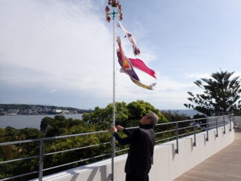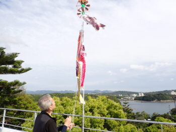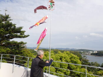 当館屋上で白浜の空を泳ぐ鯉のぼりを見てください。